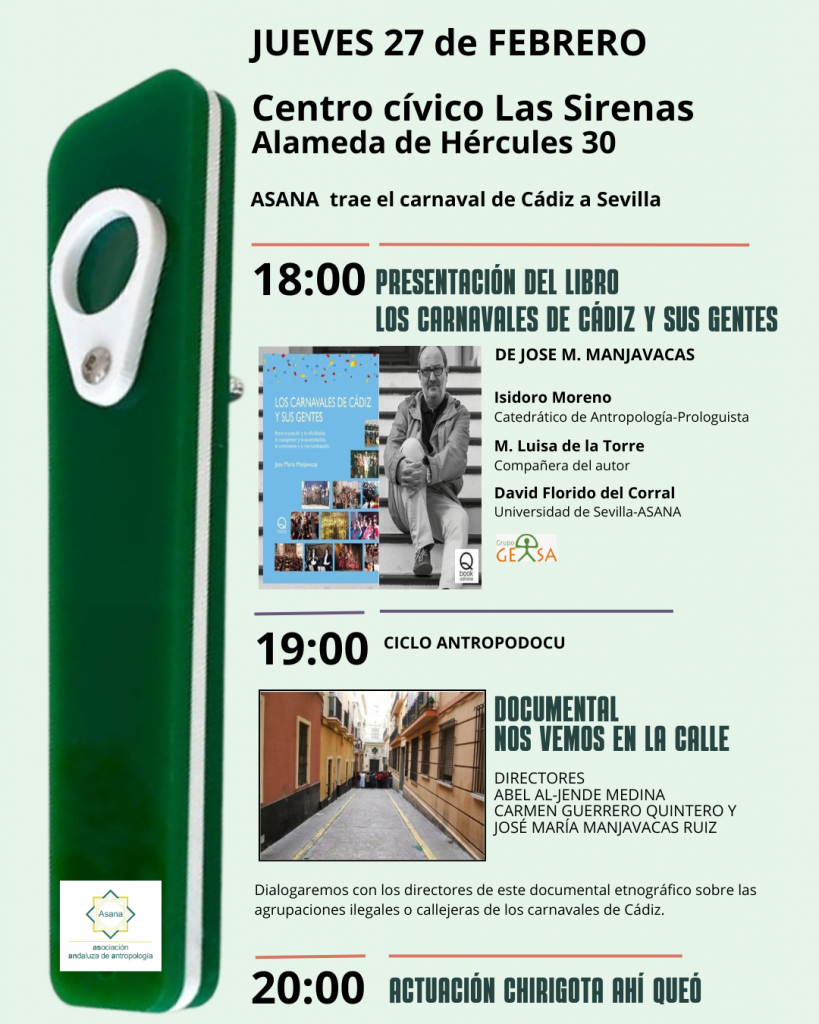 27 de febrero, 18.00 horas. El carnaval de Cadiz en Sevilla. CC Casa Las Sirenas. Entrada libre hasta completar aforo.